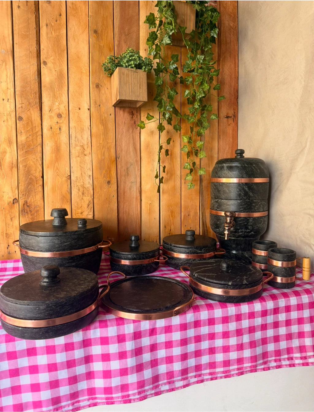 - Material: Pedra sabão, cobre (aro), plástico (torneira) e velas internas.